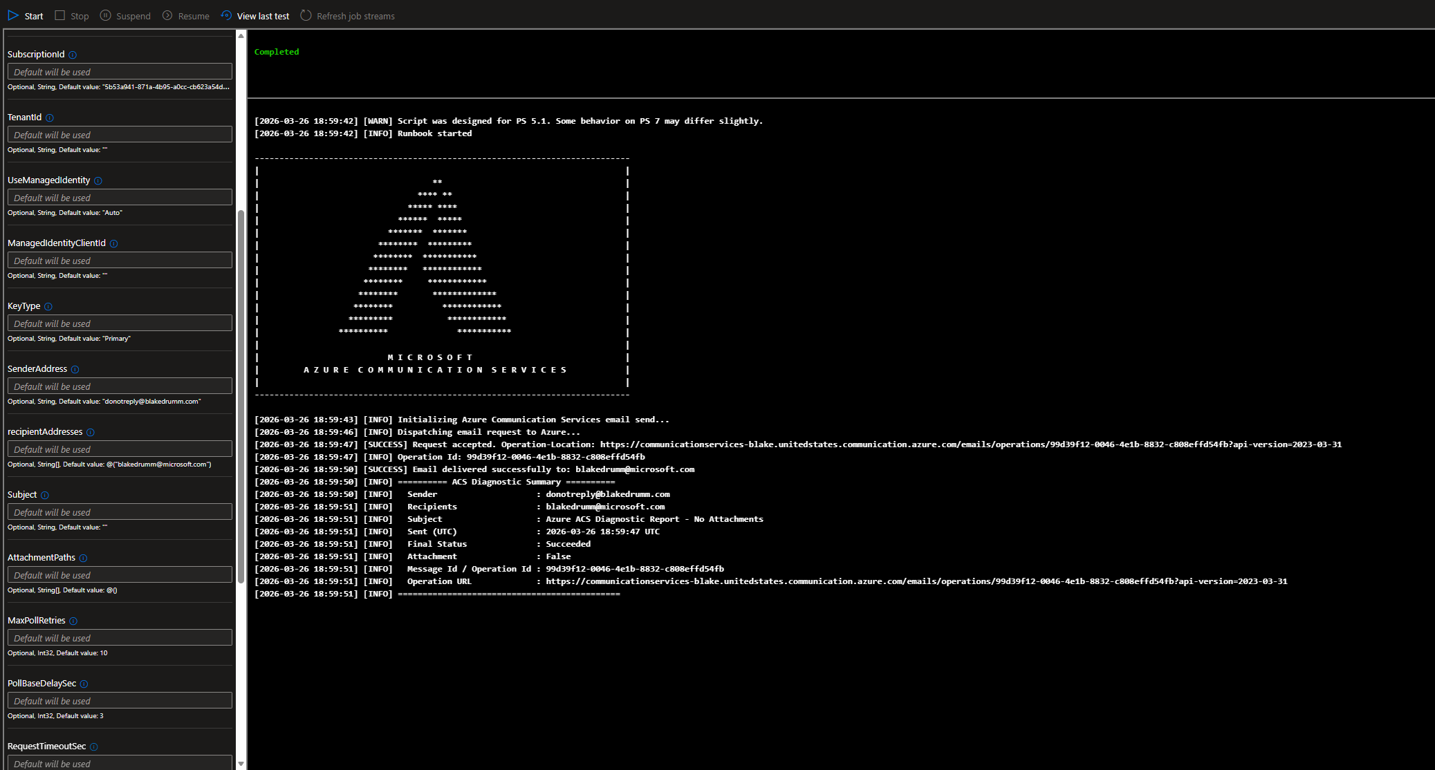 Sending email through Azure Communication Services from PowerShell requires correct authentication, proper HMAC-SHA256 request signing, and awareness of the asynchronous delivery model. This script handles all of that while remaining flexible enough to work from Azure Automation, Cloud Shell, or a local workstation.